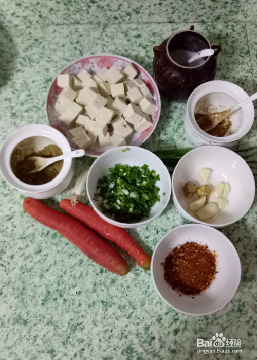 把豆腐和胡萝卜洗干净,切成2厘米大小的正方体。备用