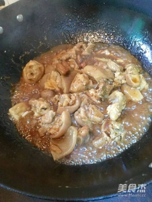 加入清水、蚝油、海鲜酱,盖上锅盖,中火焖25分钟