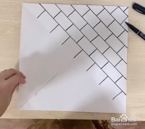 首先,我们准备一张正方形的纸,一张在上面部分我们用线条会画出图片,这样下面的,我们已经用剪刀剪。