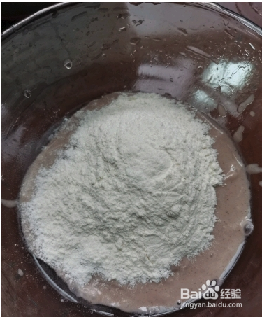 将打好的粥糊糊放入碗中,加入适量的面粉。搅拌均匀。(每种面粉和食材吸水量不同,根据适当情况增减水量,稀了就加面粉,浓稠就加水。)