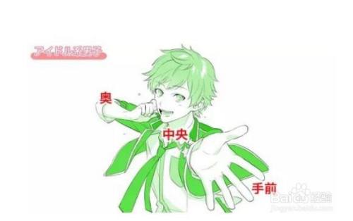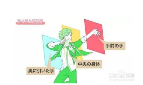 这幅图画的是一个边唱歌边伸出手的偶像系男子。如果在舞台上想要表现出,歌曲和舞蹈的,正统派偶像角色的帅气时刻的话,用有动作的姿势来表现这样的表演会比较好。
