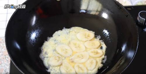 6鸡蛋凝固后上面铺上香蕉片。