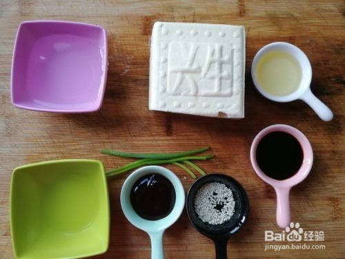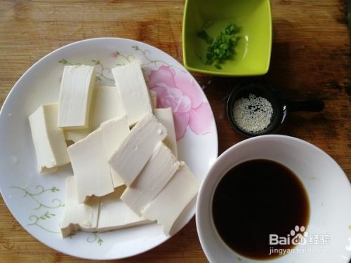 豆腐清洗干净,切成合适大小的块状。然后葱切成葱花,除了芝麻,其余配料倒入碗里,然后搅拌均匀,调成浇汁。