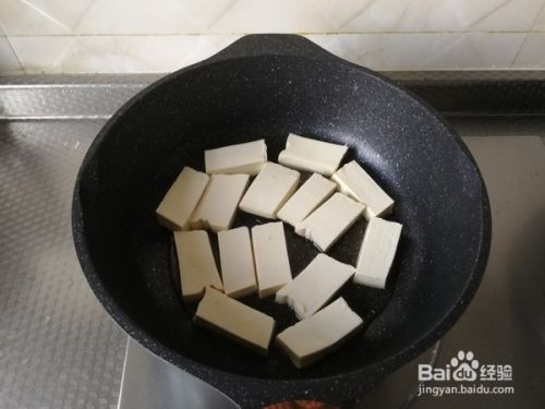 然后码入沥干水分的豆腐块,最好先用厨房纸巾擦干水分,再放入。这样油会少溅一点。