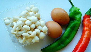 把白玉菇去掉根部,用淡盐水泡泡洗净,青红辣椒洗净切片