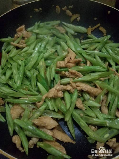 5.将切好的四季豆放入锅中反复翻炒,炒熟后放入生抽,食用盐,再继续翻炒两分钟。