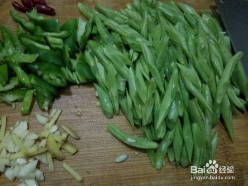 3.将四季豆掐头去尾,然后斜刀切成段,将蒜瓣拍碎,生姜切丝,辣椒切块。
