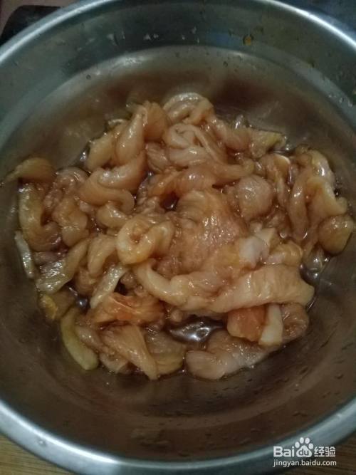 2.在碗中放入生抽料酒,将切好的鸡胸肉腌制20分钟。