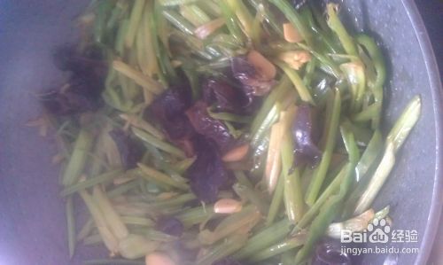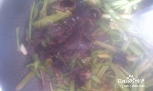 看到芹菜由只变软时,放入黑木耳,继续翻炒。