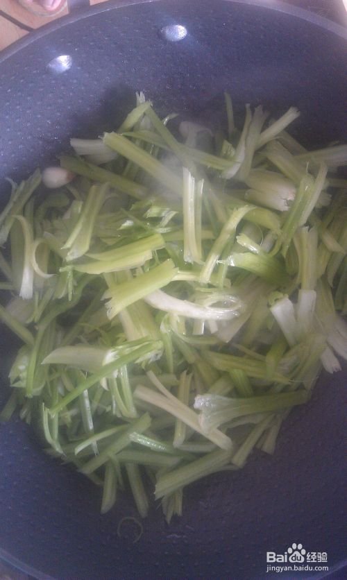 炒出蒜瓣香就放入切好的芹菜,翻炒。。。