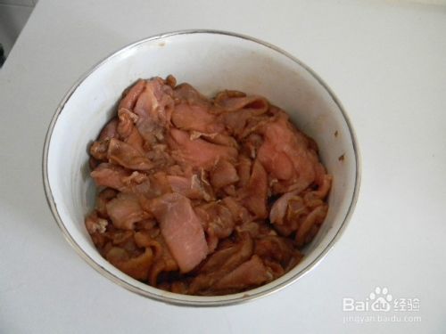 4猪里脊切薄片,放入一勺生抽和淀粉。