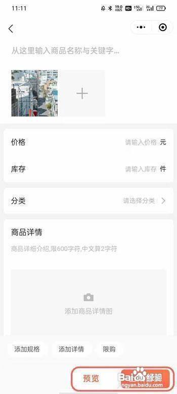 6、同时还有其他相关的设置,例如价格、库存、分类、商品详情等等,可通过【预览】提前查看展示效果;
