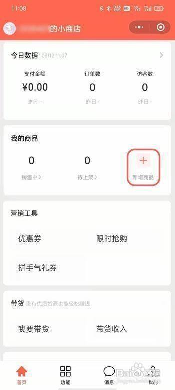 2、进入我的商店后,在【首页】点击最上方的【新增】按钮,上架自己的商品;