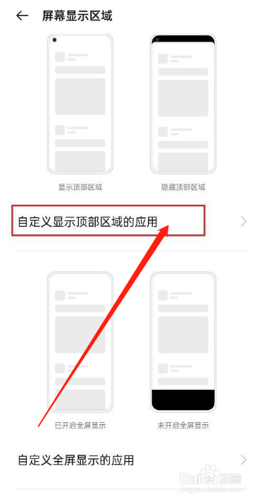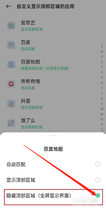 进去之后,点击要全屏显示的应用,选择隐藏顶部区域,就设置应用全屏显示了,根据需要设置
