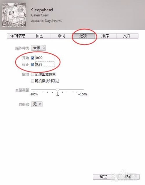 点击‘选项’,填写要节截取歌曲的时间点,并且勾选开始和停止时间选项。这里要注意的是iphone手机铃声不能超过40秒,尽量控制在39秒,如果超过时长会提醒你同步不成功。