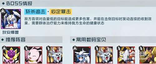 建议选用群体治疗能力强的数码兽来保持队伍血线健康;一旦血量低于75%,BOSS就能额外造成更多的伤害,如果有数码兽被斩杀,BOSS还能连续收割带来毁灭性打击;