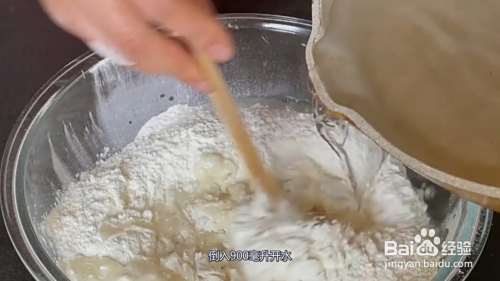 碗中放500克面粉,加入10克的糖,倒入900毫升开水,搅拌到面团状态。