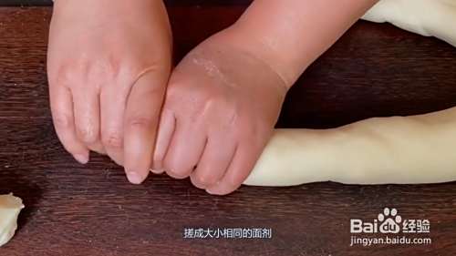 案板上抹油,放上面团,用手把面团压平,加入50克面粉、30毫升玉米油,用手抓揉6分钟,搓成大小相同的面剂,盖上保鲜膜。