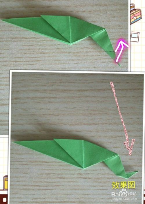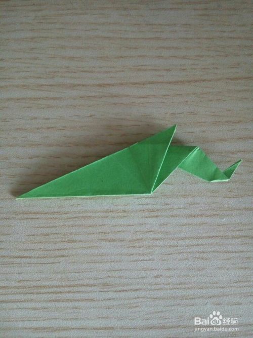 将上一步翻折上去的尖角部分再沿所画虚线向外下方折叠!效果如下!