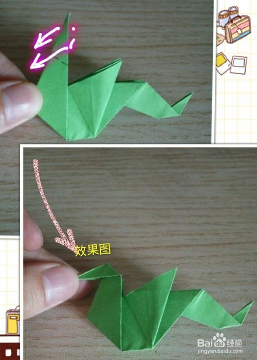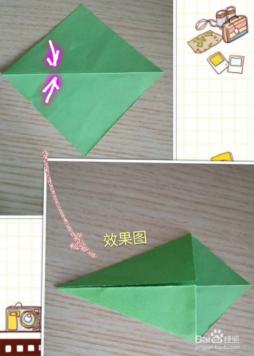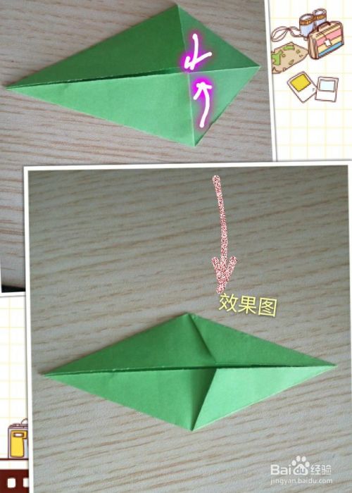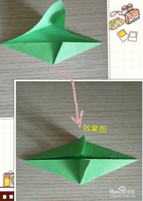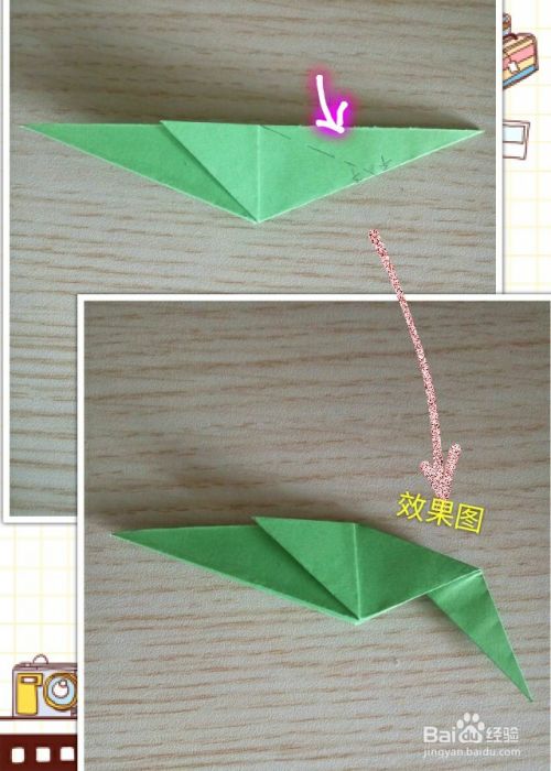 将上一步翻折下来的尖角部分再沿所画虚线向内上方折叠!效果如下!