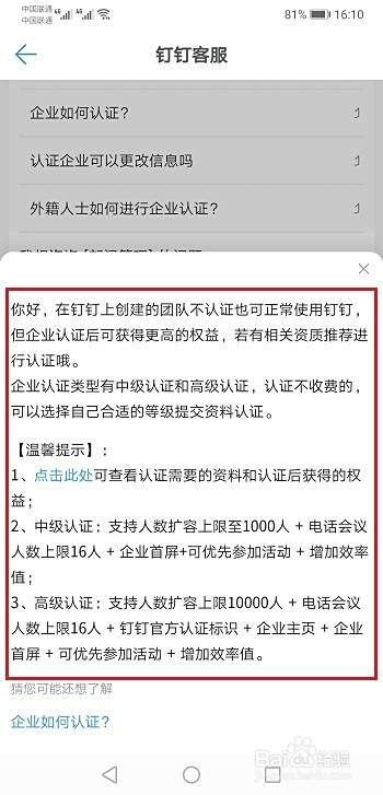 第一步我们首先需要知道钉钉企业认证可以获得更高的权益操作,有中级认证和高级认证,认证不收费,不认证也可以正常使用,但是权益会低一些,如下图所示: