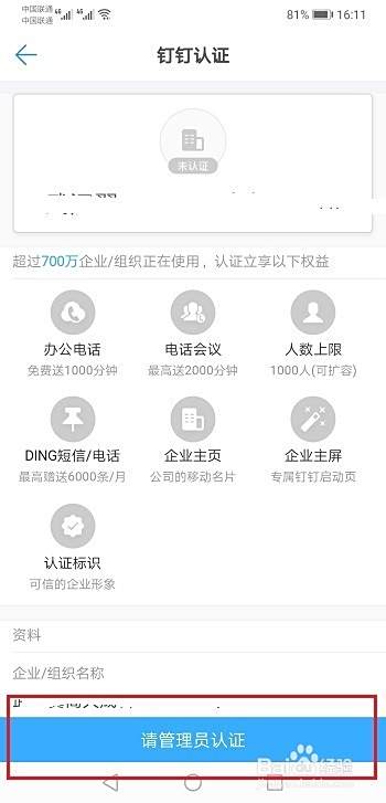 第六步进去钉钉认证界面之后,可以进行认证,如果不是管理员可以请管理员进行认证,如下图所示: