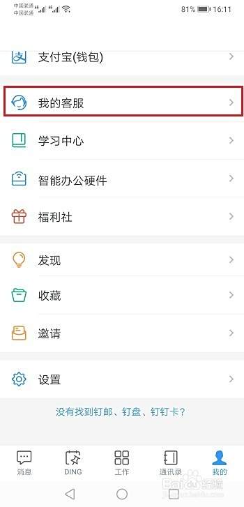 第二步下面来介绍一下钉钉上怎么认证企业,进去钉钉之后,点击我的客服,如下图所示: