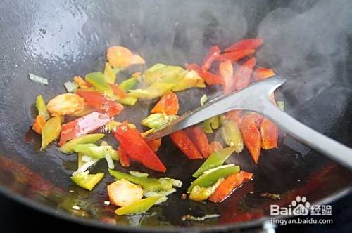 炒锅加入适量的油,爆香葱蒜末,下入青、红椒翻炒