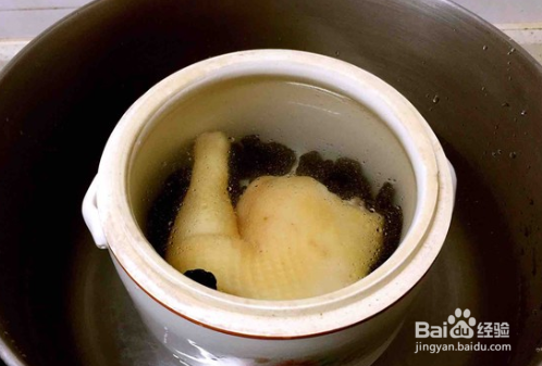 6. 炖盅盖盖子,放进加水的锅里,开始炖煮。
