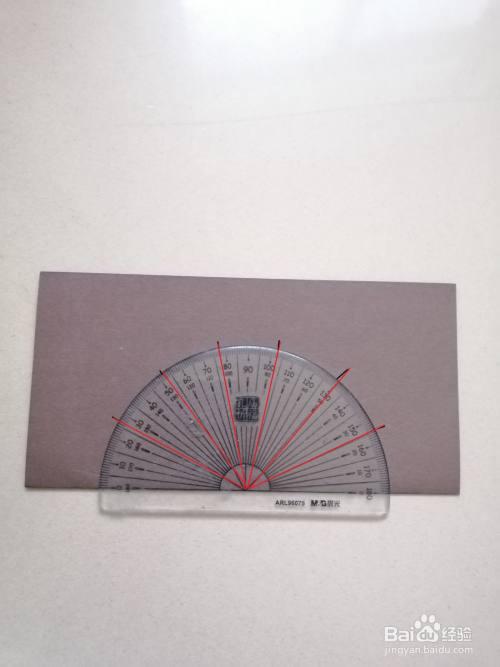 拿出量角器,中心点与步骤2折叠的位置重合,每隔约25.5°点一个点,一共点6个点。