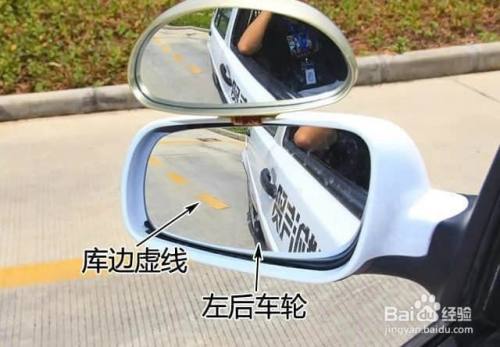 继续观察左后视镜,看到左后轮压到库边虚线时,迅速向左打死方向盘。