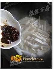 萝卜和豆腐都切粗条,萝卜先下油锅滑炒一下后将豆腐放入,加少许水焖至萝卜软身。