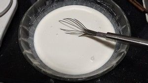 在锅中倒入100克牛奶、200克椰浆煮沸,将煮沸的牛奶及椰浆混合液一边搅拌一边慢慢倒入上一步开好的椰浆粉浆中,成白色生熟浆。