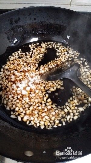 锅烧热,在锅中放入3分之1的白糖炒糖色,糖溶后加入375克水及余下白糖煮至全部溶化,加入切好的马蹄粒,煮沸。加入小量的生浆开成芡汁。