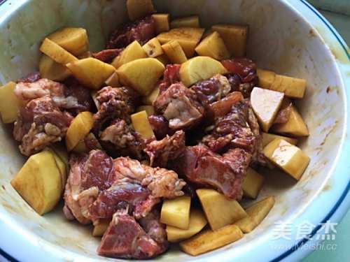 取出土豆码在盘侨艺底,蒸肉粉加水调成糊状,使排骨均匀裹上粉糊。拌好的排骨平铺在土豆上。放入锅中蒸熟即诸沟盲可。