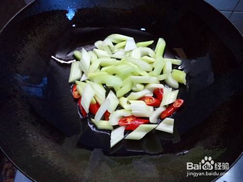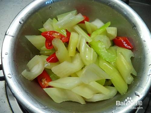 锅烧热,放少许油,下西芹与红椒翻炒。