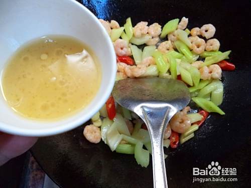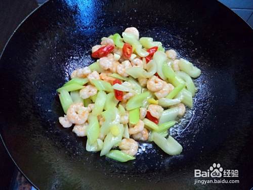虾仁稍微变色后,把之前炒好的西芹与红椒回锅,并倒入碗汁。