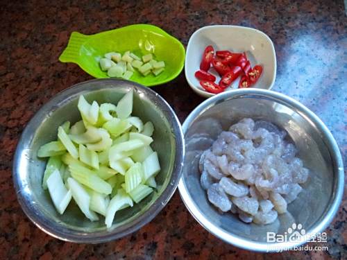 西芹洗净切小块,姜蒜切小片,红椒切小段,鲜虾剥壳去虾线,洗净备用。