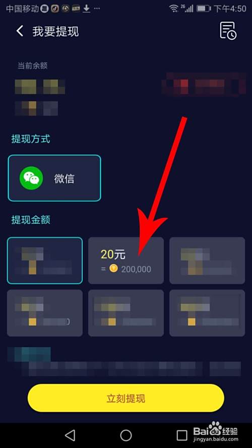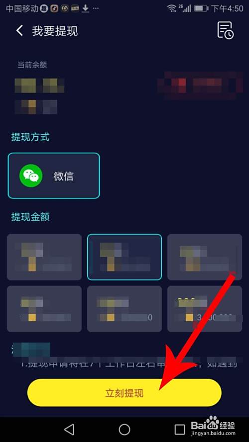 选定提现金额,最后点击界面底部的“立刻提现”,然后等待到账即可