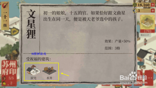 文星狸可以祝福附近3格位置的民宅和水井,让它们增产50%。
