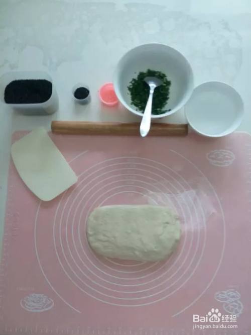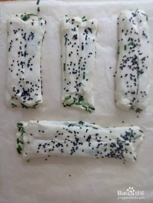 面团擀边码扁平长薄方型,把葱花加油盐拌均匀后撒在面皮上。