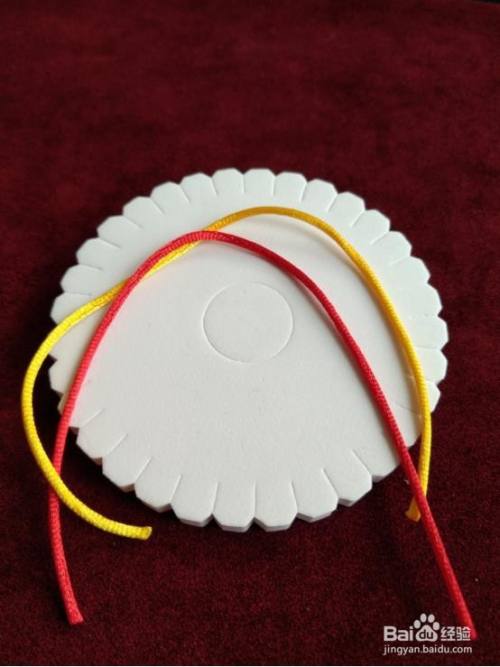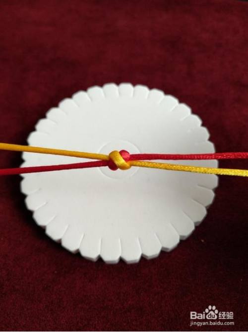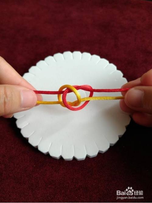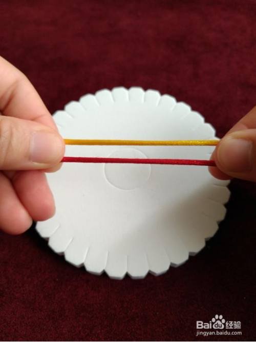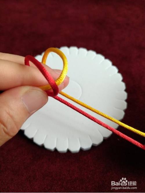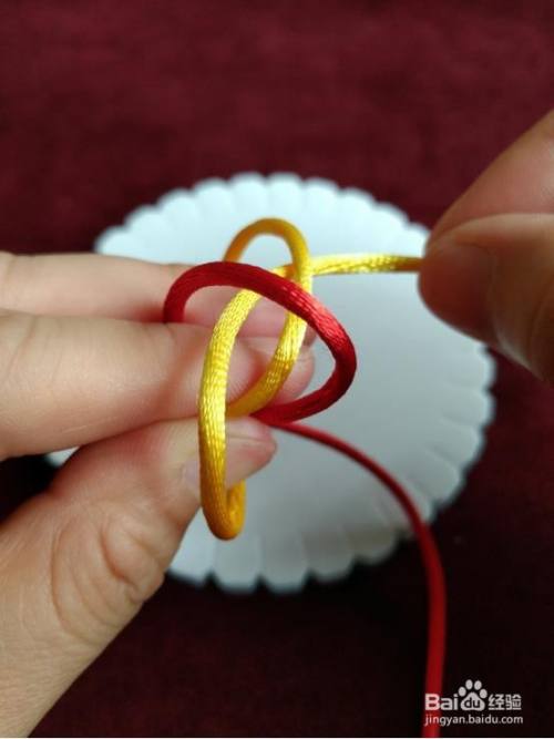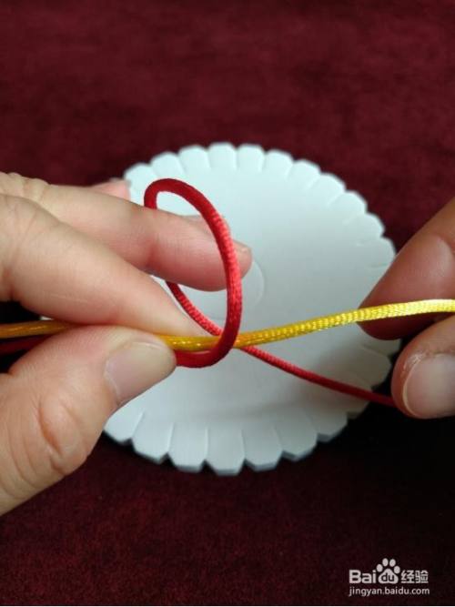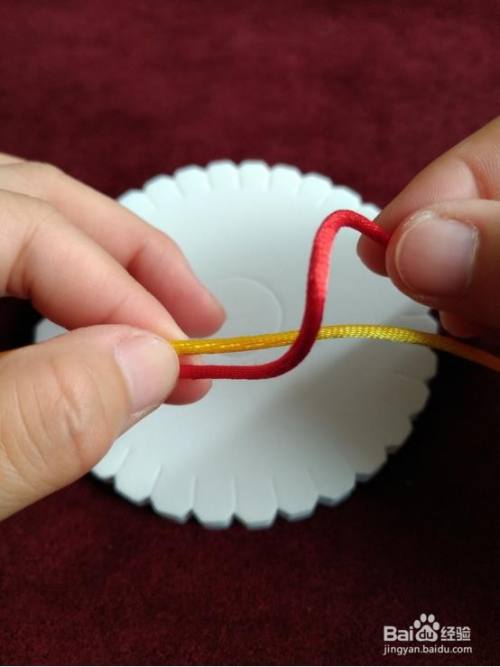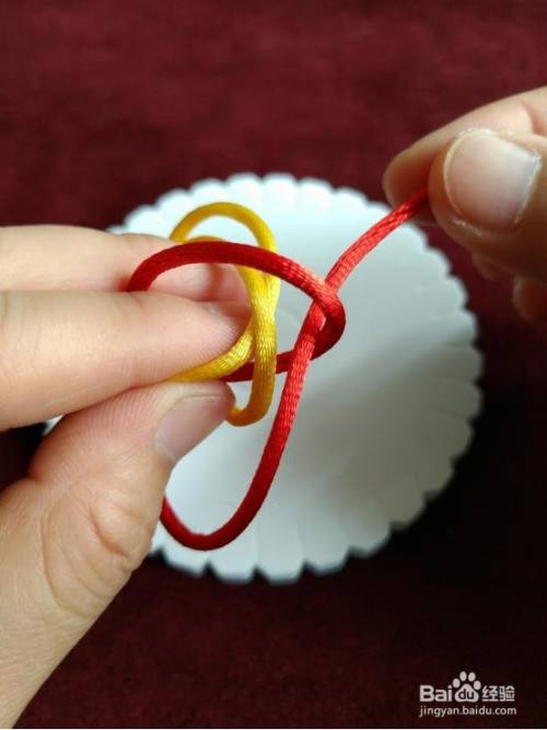 左手拇指和食指捏住两根线,右手将红色线如图绕过黄色线。