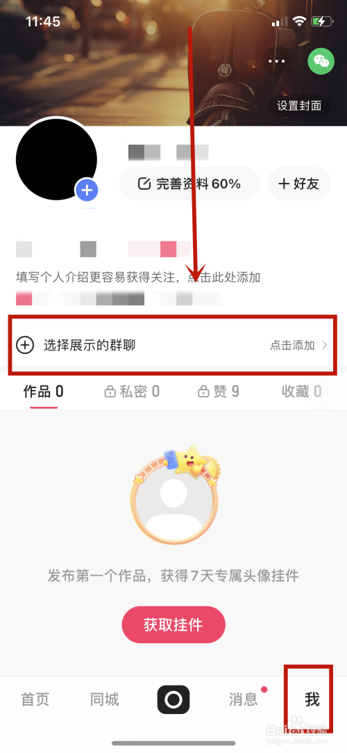 打开快手进入我的页面,点击【选择展示的群聊】;