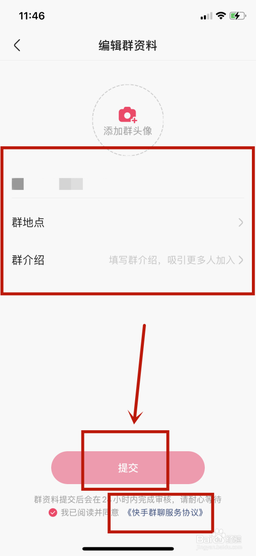 最后,在编辑群资料页面上传群头像、群命名...后仔细浏览服务协议后勾选,【提交】后等待审核通过即可。