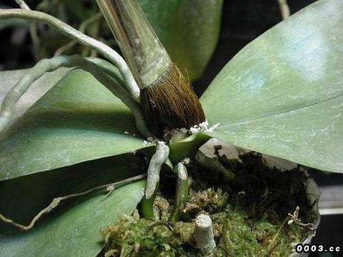 将开花后花梗上的残花连花梗剪去,注意保留未萌发的芽节(大约有三四节)。把最上面一二节芽上的苞片小心除去,露出节芽,注意不可伤及 芽子,取少量的催芽剂(植物激素)均匀涂在节芽上,若能将除去苞片后的伤口也涂抹盖上,效果更好。将处理好的兰花置于适宜的地方(能见光又不直晒)。温度需保持在25~30℃、湿度在75%以上,2~3个月就可长出新的花苗来。当新苗长到一定大小时,在其基部用薄膜包少量水苔裹住,当小苗长出二三根粗根时,即可剪下单独种植。