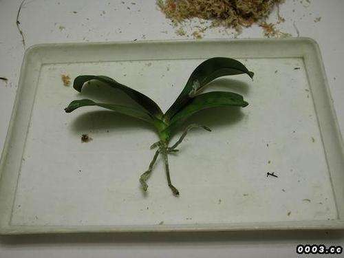6将处理好的兰花置于适宜的地方(能见光又不直晒)。温度需保持在25~30℃、湿度在75%以上,2~3个月就可长出新的花苗来。当新苗长到一定大小时,在其基部用薄膜包少量水苔裹住,当小苗长出二三根粗根时,即可剪下单独种植。图为将处理过的花茎固定在水苔上,已生出三片页和两条根。可剪下单独种植了。