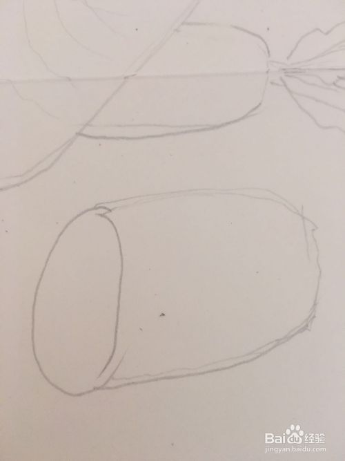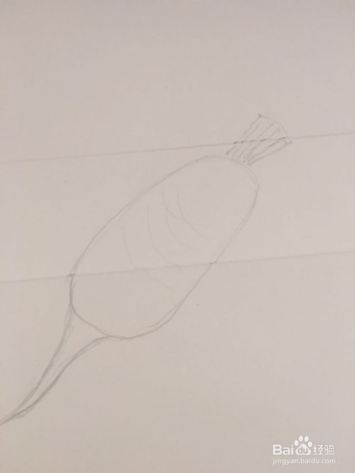第二步 再根据这个长椭圆形 修改成一个青萝卜的草图 再画上青萝卜的叶子梗