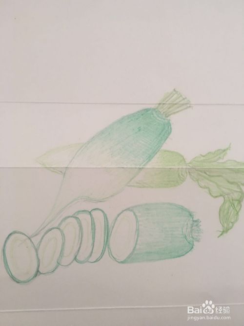 青萝卜 冬令时期的瓜果候补品 在我们这儿叫弯腰青 青萝卜 热量少 纤维素多 这些对减肥有极大的帮助 经常吃萝卜对防癌抗癌 降血脂 稳定血压 预防冠心病 动脉硬化等等 起着重要的作用 下面我们就画画青萝卜的彩铅画