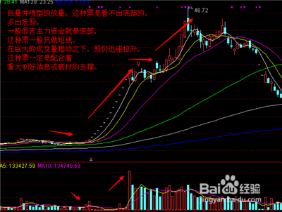 巨量井喷型的放量。这种票是看不出底部的。多出妖股。一般而言主力资金就是底部,这种票一般只做短线。在巨大的成交量推动之下,股价迅速拉升。这种票一定是配合着重大利好消息或题材的支撑。