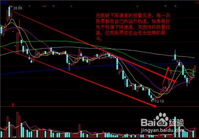 在跌破下降通道的放量见底。每一只股票都有自己的运行轨道。如果股价先于标准下降通道,突然性的放量拉高。这类股票往往会走出短期的黑马。